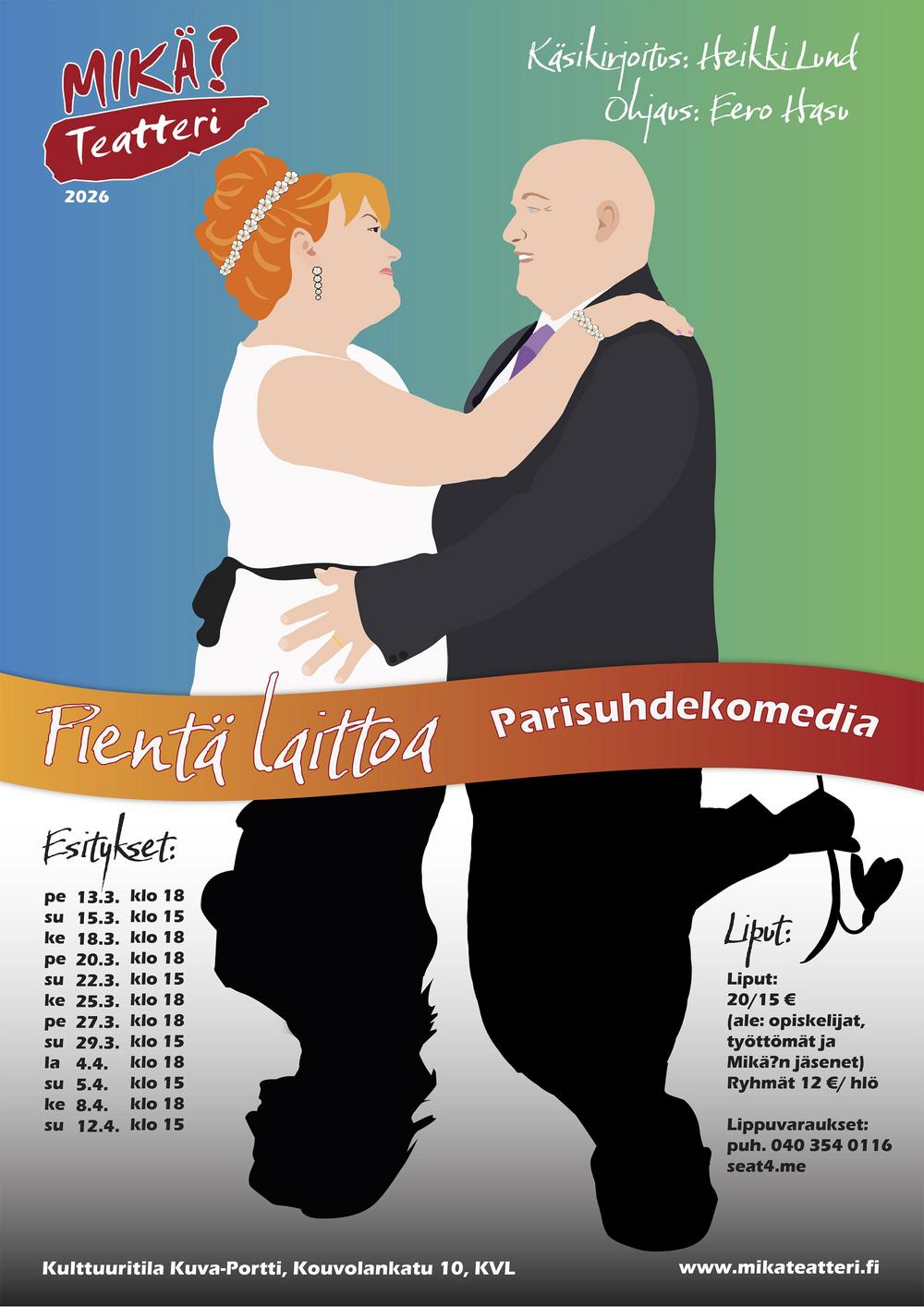 Parisuhdekomedia Pientä laitoa on hulvattoman hauska tarina Makesta ja Lissusta, pariskunnasta, joka on viettänyt 25 vuotta yhteistä avioliittoa. Vieläkö kipinät sinkoilevat – vai alkaako peli olla pelattu? Tunnelma tiivistyy yhteen iltaan teatterireissun jälkeen, kun arjen kulisseja aletaan raottaa ehkä vähän liiankin rehellisesti. Suut puhdistetaan – ja sanailu käy kuumana.